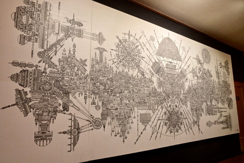 綿密な線画で描かれた空中都市。それは超未来的でありながらも一つ一つの建物はどこか懐かしいものであったり、自然からエネルギーをもらいまた戻すという循環があったりと人の心の優しさを感じる。